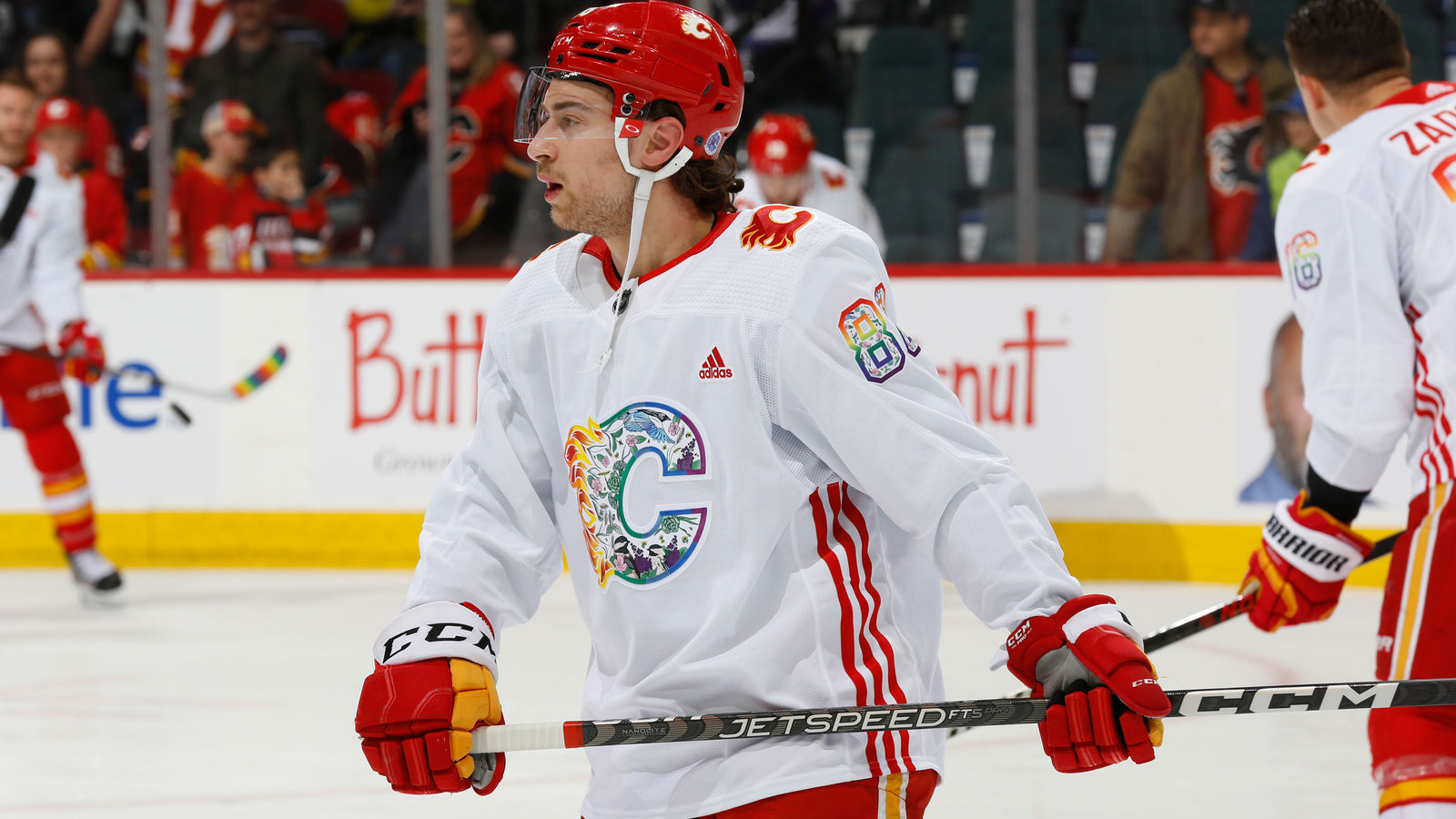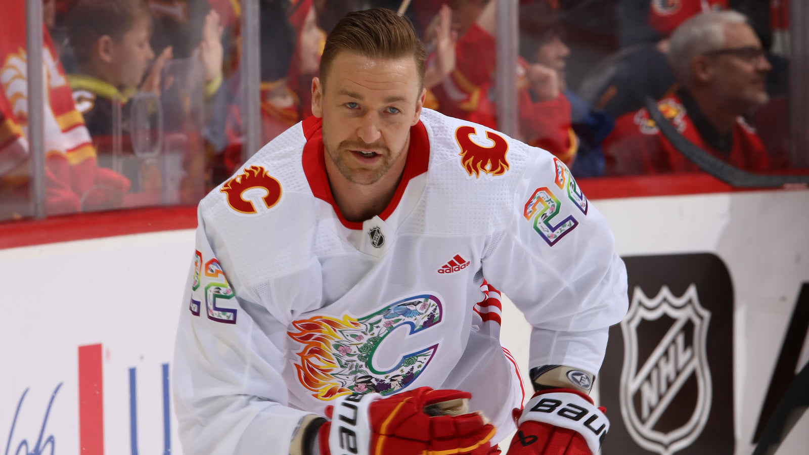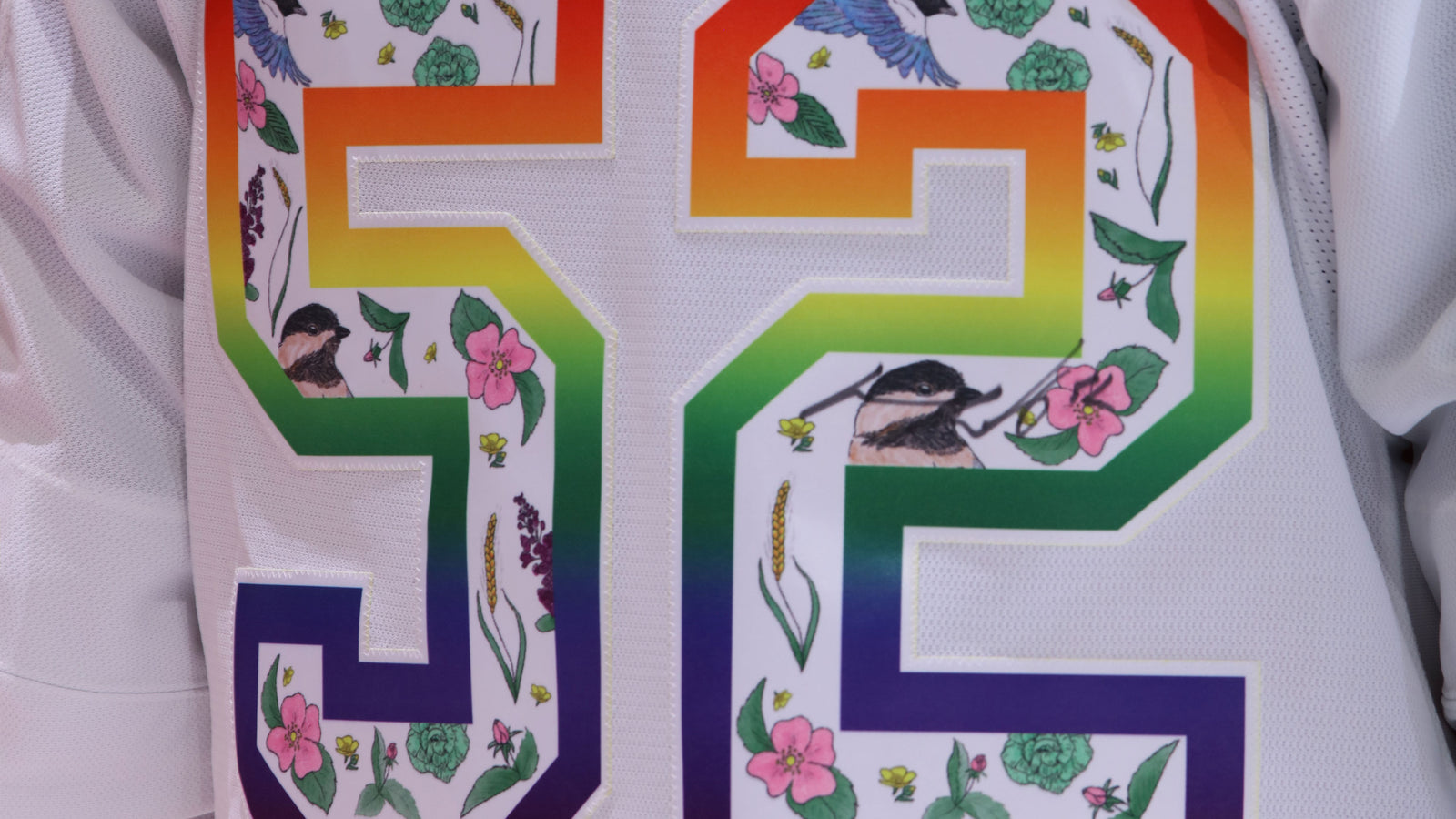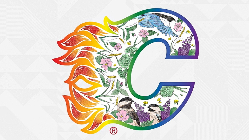 The logos and pattern inside the 2023 Pride Jersey were designed by a local artist from the LGBTQ2+ community, Megan Parker. The pattern has incorporated flora and fauna from the Alberta prairies and arranged them all in a soft and inviting pattern, loosely based on the same colour pattern as the pride flag.